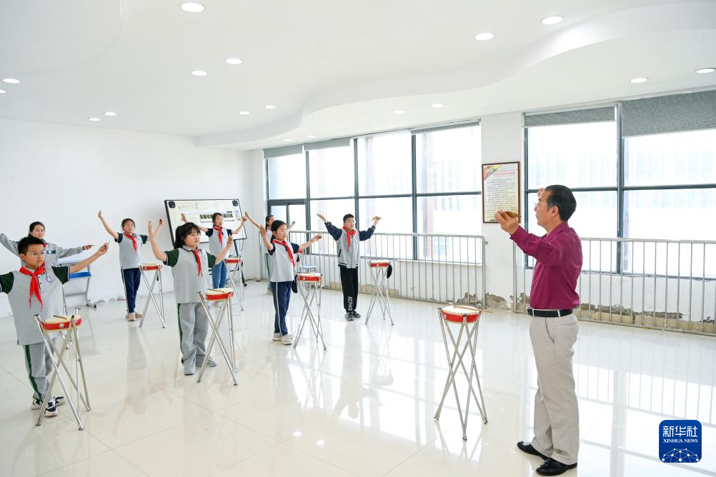 5月12日,宿迁市宿城区实验小学非遗教室内,学生在牛崇祥的指导下学习苏北大鼓。