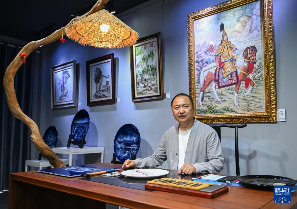 6月6日,陈银付在江苏盐城大丰瓷刻展示馆内创作,室内摆放着他创作的瓷刻作品《松下贤士》。