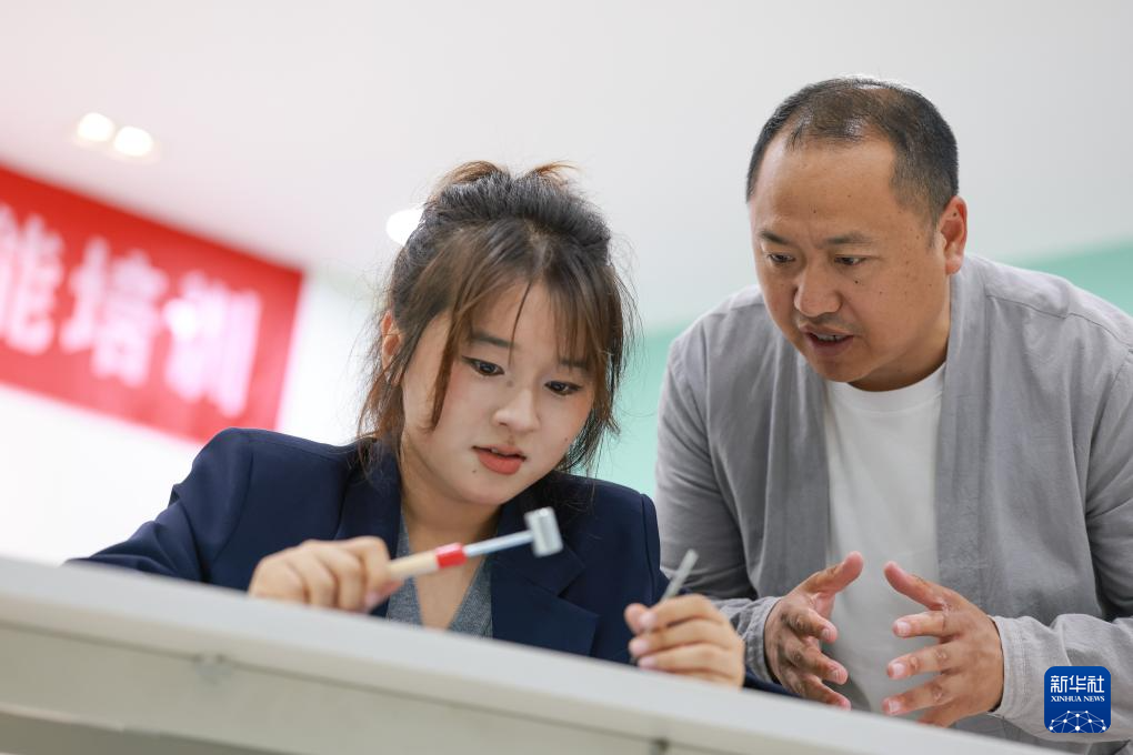 6月6日,在江苏盐城大丰瓷刻展示馆的教室里,陈银付指导学生崔静蕾练习瓷刻技艺。