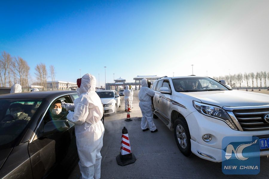 Medical workers check passengers' body temperature at a highway exit in Harbin, northeast China's Heilongjiang Province, Jan. 31, 2020. (Xinhua/Wang Song)
