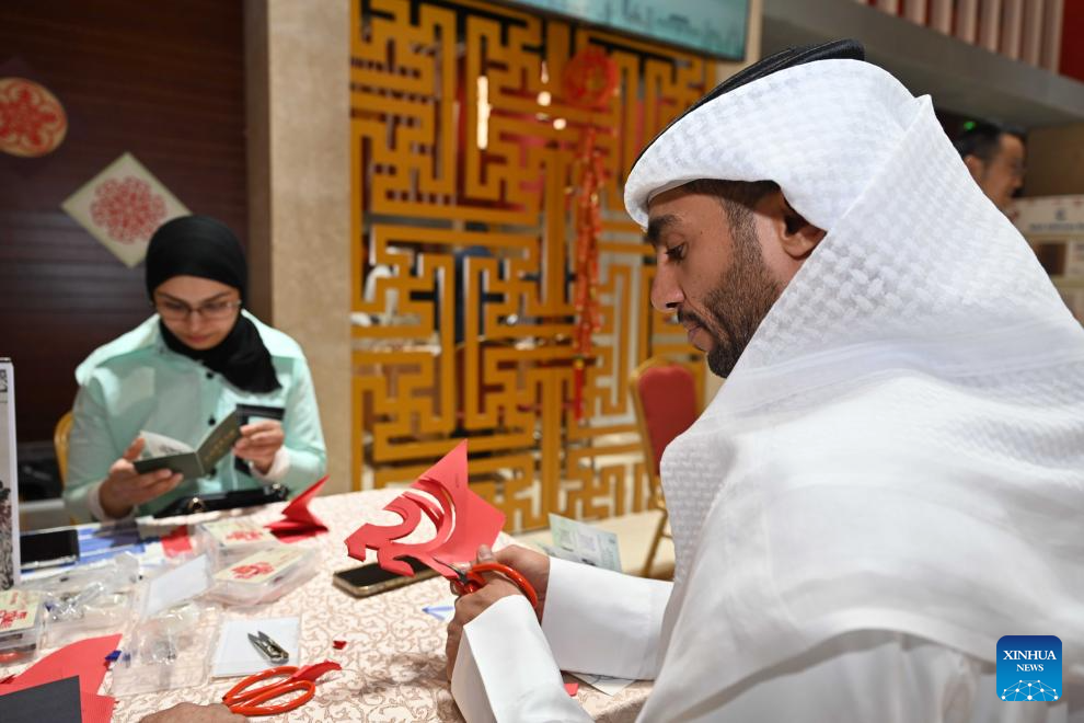 People experience Chinese paper-cutting during a culture event in Hawalli Governorate, Kuwait, April 20, 2025. A culture event marking the International Chinese Language Day and Chinese embassy open day was held in Kuwait's Hawalli Governorate on Sunday, with around 200 guests gathering to taste traditional Chinese food and experience Chinese ink painting, calligraphy, paper-cutting, tea art and so on. (Photo by Asad/Xinhua)