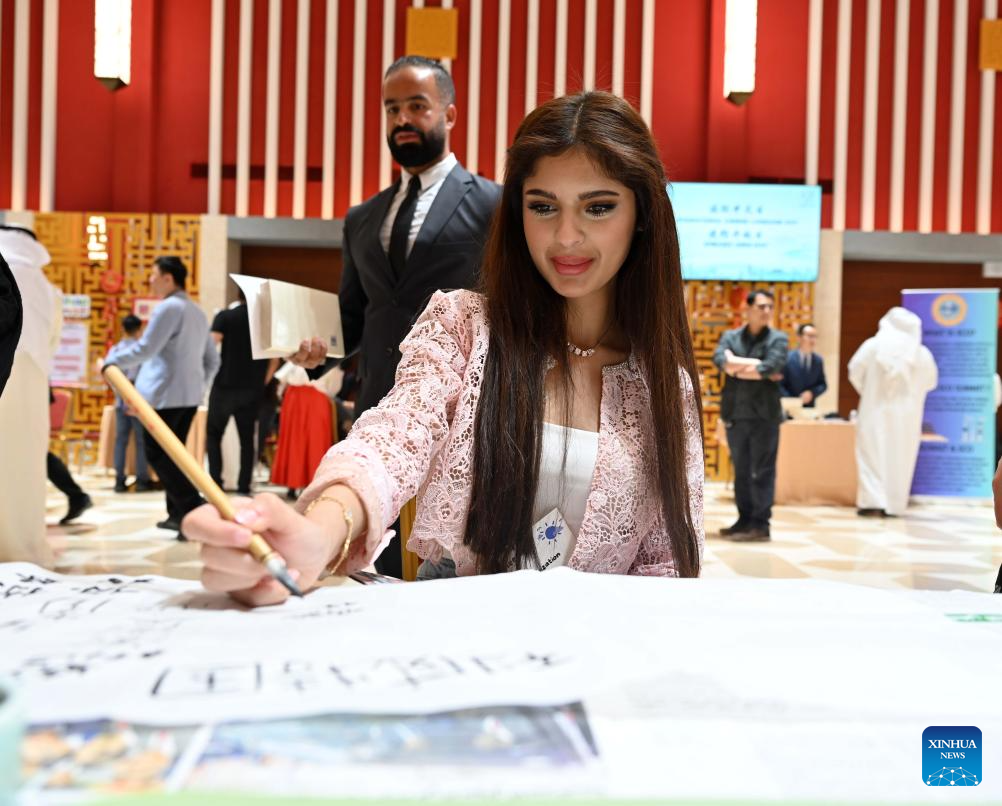 A woman experiences Chinese calligraphy during a culture event in Hawalli Governorate, Kuwait, April 20, 2025. A culture event marking the International Chinese Language Day and Chinese embassy open day was held in Kuwait's Hawalli Governorate on Sunday, with around 200 guests gathering to taste traditional Chinese food and experience Chinese ink painting, calligraphy, paper-cutting, tea art and so on. (Photo by Asad/Xinhua)