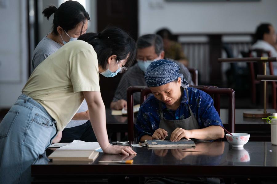 Book restorer Zhou Yahan (front, R) demonstrates restoration techniques at Anhui Provincial Library in Hefei, east China's Anhui Province, June 4, 2025.(Xinhua/Zhang Duan)Book restorer Zhou Yahan demonstrates restoration techniques at Anhui Provincial Library in Hefei, east China's Anhui Province, June 4, 2025. (Xinhua/Zhang Duan)