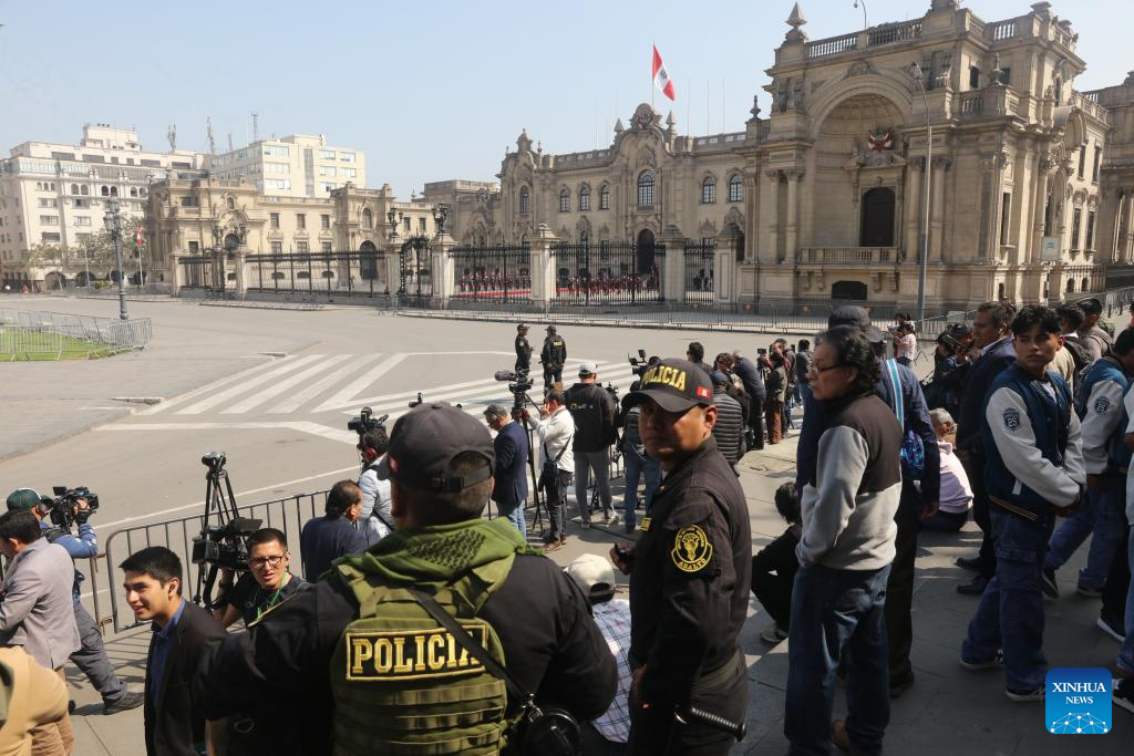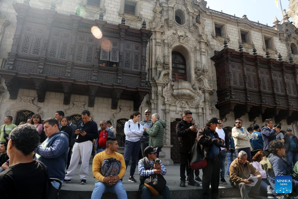 People wait for the arrival of Peruvian President Jose Jeri in front of the Government Palace in Lima, Peru, Oct. 10, 2025. (Xinhua/Mariana Bazo)