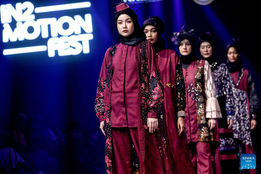 Models present creations of Gita Orlin x Dekranasda Kota Surabaya during the 2025 Indonesia International Modest Fashion Festival in Jakarta, Indonesia, Oct. 9, 2025. (Xinhua/Agung Kuncahya B.)