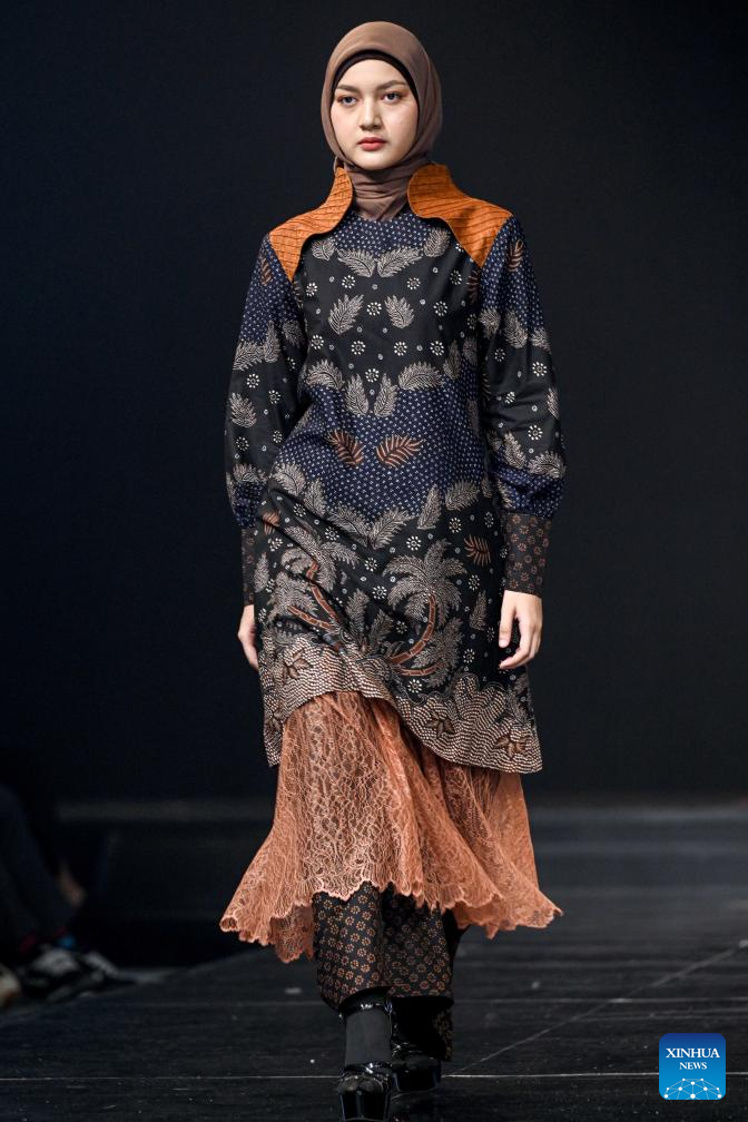 A model presents a creation of Batik Martadireja during the 2025 Indonesia International Modest Fashion Festival in Jakarta, Indonesia, Oct. 9, 2025. (Xinhua/Agung Kuncahya B.)