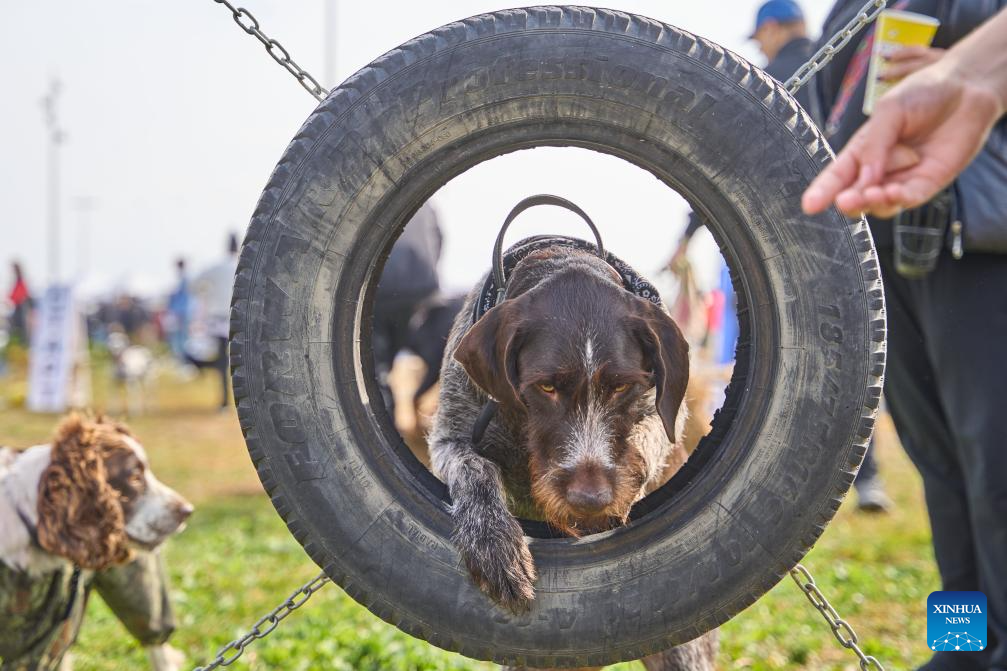 A dog participates in a ring-jumping game during a dog carnival in Vladivostok, Russia, Oct. 12, 2025. The Russian city of Vladivostok held a dog carnival at Akhlyostyshev Beach on Sunday, featuring pet skill shows, a costume show, and fun competitions. The event attracted many residents to take part with their pet dogs. (Photo by Guo Feizhou/Xinhua)
