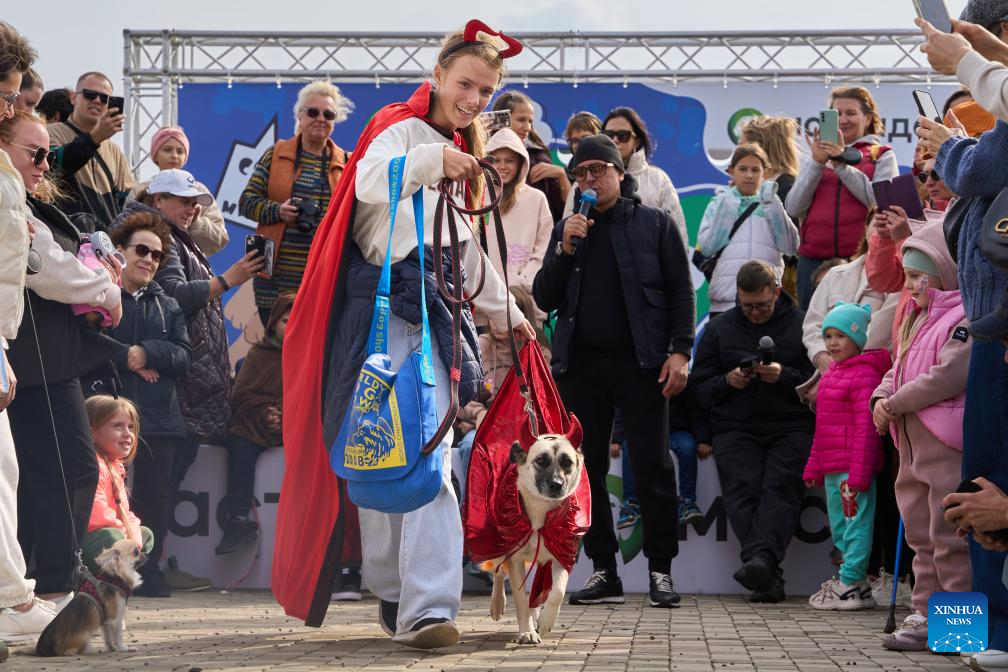 A dog and its owner participate in a costume show during a dog carnival in Vladivostok, Russia, Oct. 12, 2025. The Russian city of Vladivostok held a dog carnival at Akhlyostyshev Beach on Sunday, featuring pet skill shows, a costume show, and fun competitions. The event attracted many residents to take part with their pet dogs. (Photo by Guo Feizhou/Xinhua)