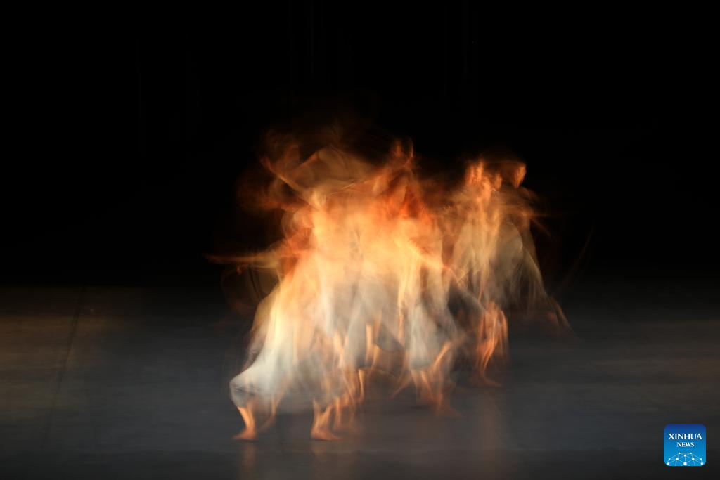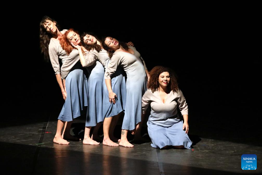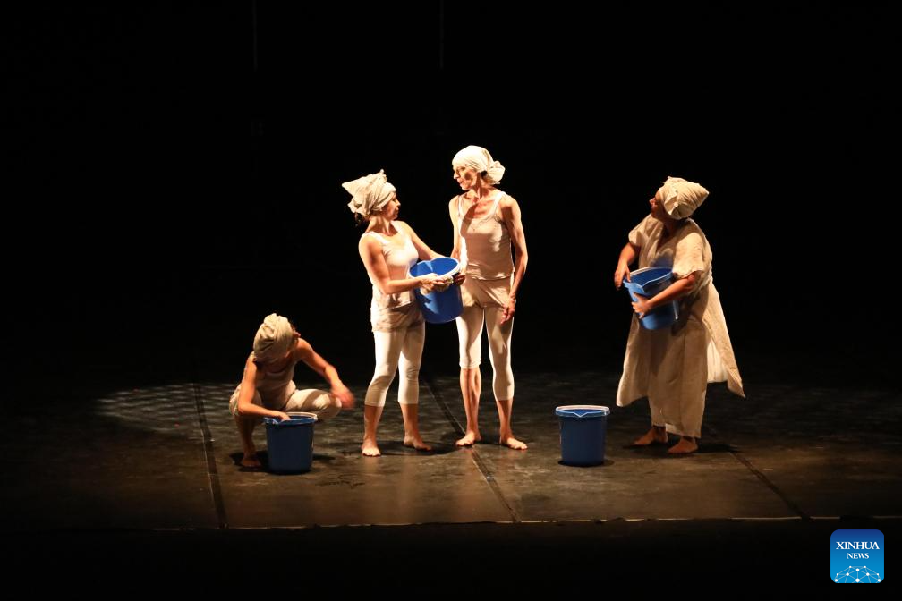 Artists from Spanish contemporary theatre and dance troupe HOJARASCA perform during the sixth edition of Baghdad International Theatre Festival, in Baghdad, Iraq, on Oct. 11, 2025. (Xinhua/Khalil Dawood)
