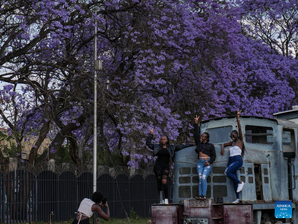 People take photos in front of an old locomotive against the background of blooming jacaranda trees in Nairobi, Kenya, on Oct. 12, 2025.