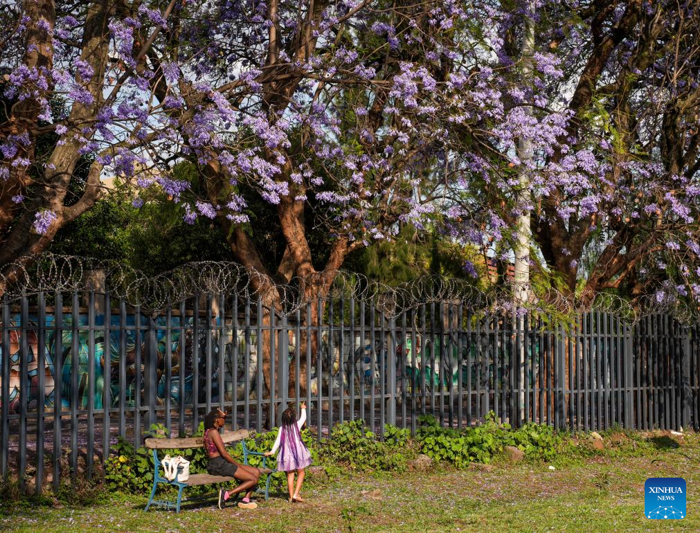 People enjoy leisure time under blooming jacaranda trees in Nairobi, Kenya, on Oct. 12, 2025.