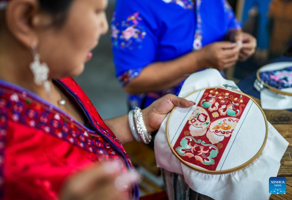 Long Luying (C) makes embroidery at the workshop in Shibing County of Qiandongnan Miao and Dong Autonomous Prefecture, southwest China's Guizhou Province, Oct. 10, 2025.