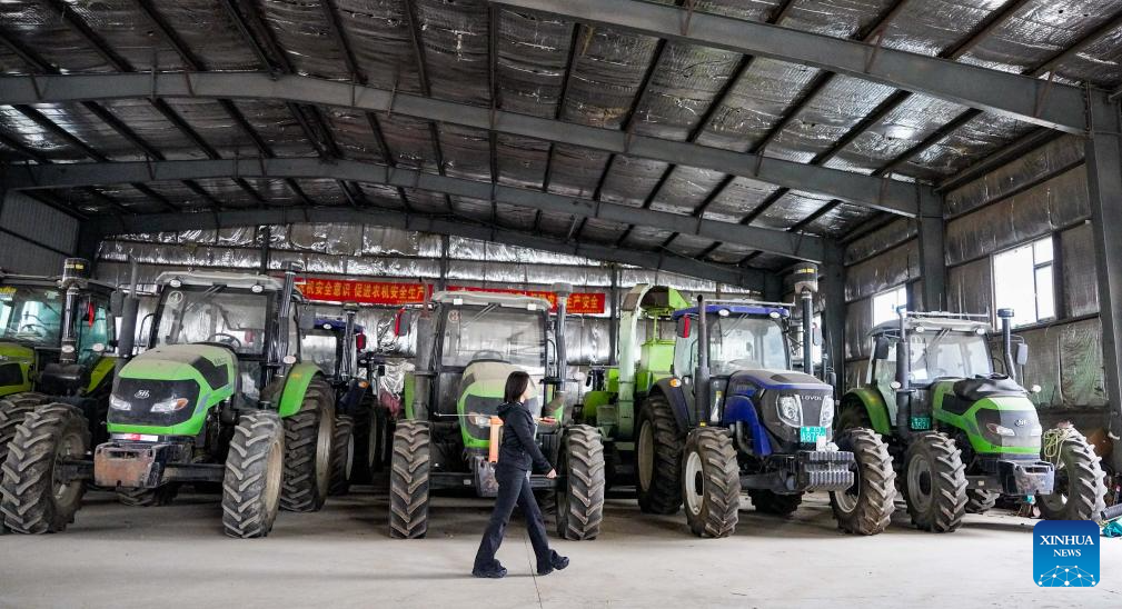 Han Fengxiang checks agricultural machinery at her cooperative's warehouse in Lishu County, northeast China's Jilin Province, Oct. 9, 2025. Han Fengxiang, 43, returned to her hometown in Jilin's Lishu County to run a cooperative in 2010. Instead of relying on traditional farming methods, Han carried out mechanized farming leveraging large-scale agricultural machinery to enhance the grain output. With years of operation, the cooperative currently boasts 76 sets of large agricultural machinery and manages 1,000 hectares of land with mechanized cultivation.