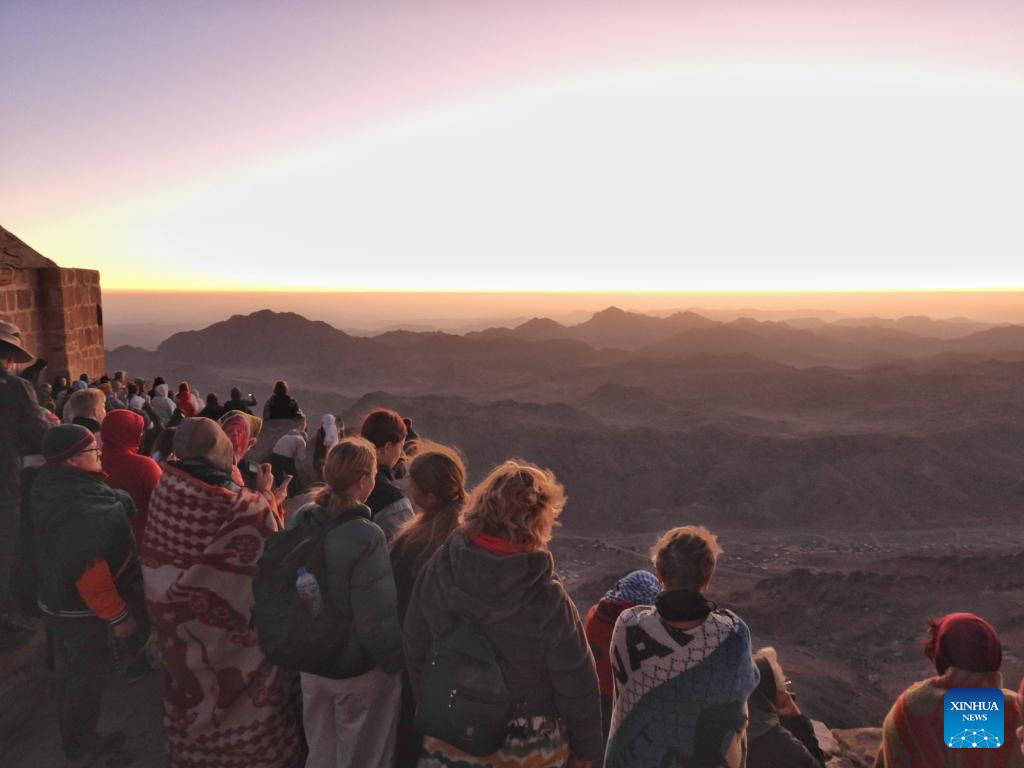 Tourists view the scenery at sunrise from Mount Sinai in the Sinai Peninsula, Egypt, Oct. 11, 2025. (Photo by Liu Minhao/Xinhua)