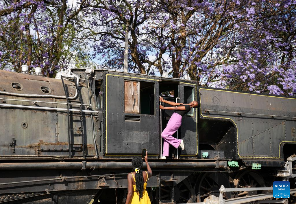 People take photos in front of an old locomotive against the background of blooming jacaranda trees in Nairobi, Kenya, on Oct. 12, 2025.