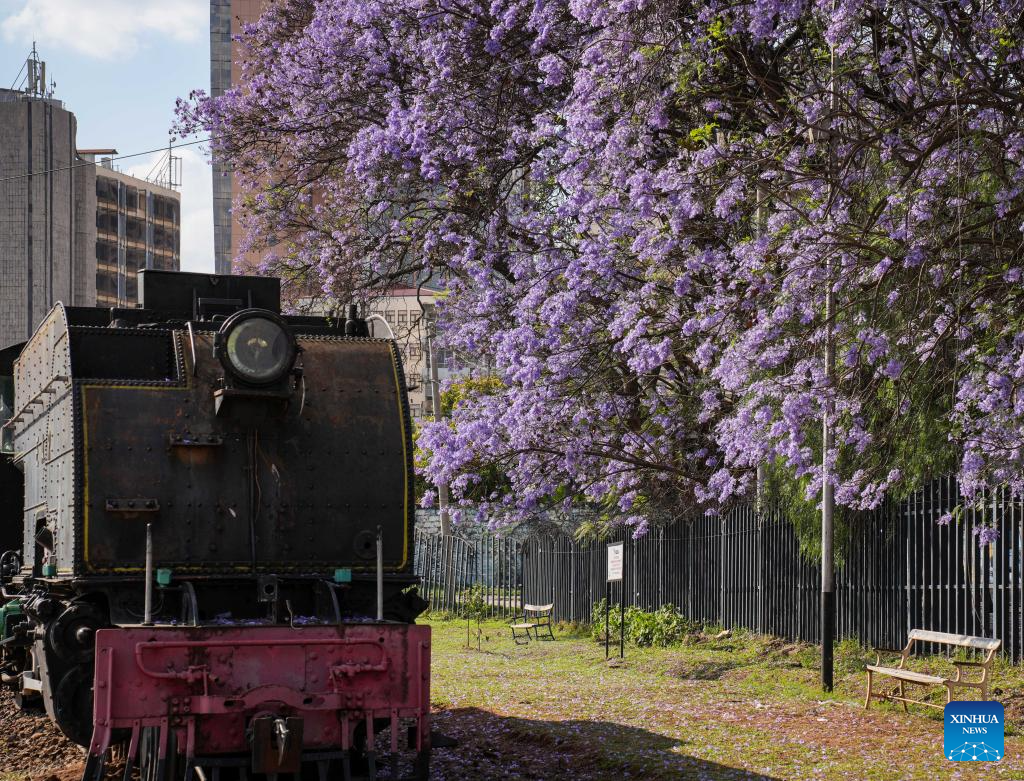 This photo taken on Oct. 12, 2025 shows an old locomotive and blooming jacaranda trees in Nairobi, Kenya.