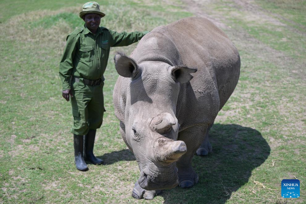 A staff member interacts with the female northern white rhino "Najin" at the Ol Pejeta Conservancy in Laikipia County, Kenya, Oct. 7, 2025. "Najin" and "Fatu" are the last two living northern white rhinos on earth. They are now housed at Ol Pejeta Conservancy in Laikipia County, Kenya. (Xinhua/Yang Guang)