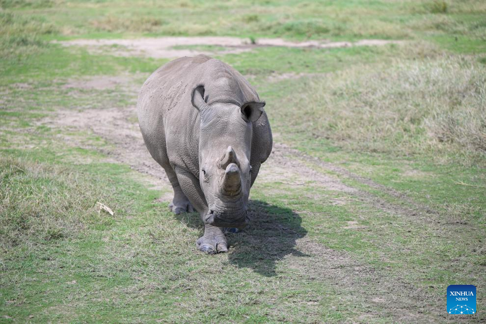 This photo taken on Oct. 7, 2025 shows the female northern white rhino "Najin" at the Ol Pejeta Conservancy in Laikipia County, Kenya. "Najin" and "Fatu" are the last two living northern white rhinos on earth. They are now housed at Ol Pejeta Conservancy in Laikipia County, Kenya. (Xinhua/Yang Guang)
