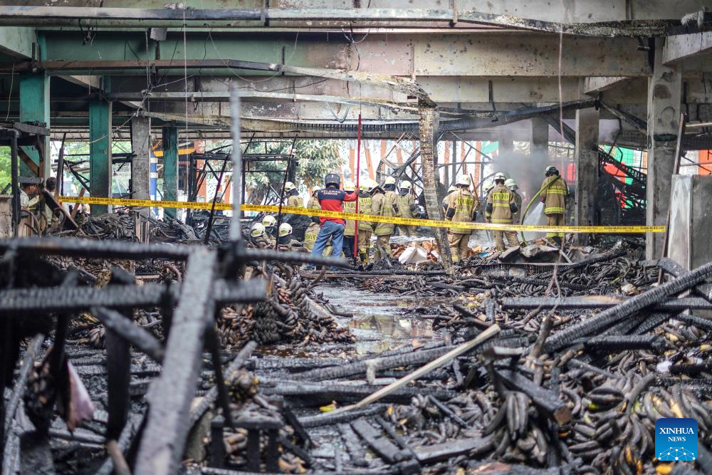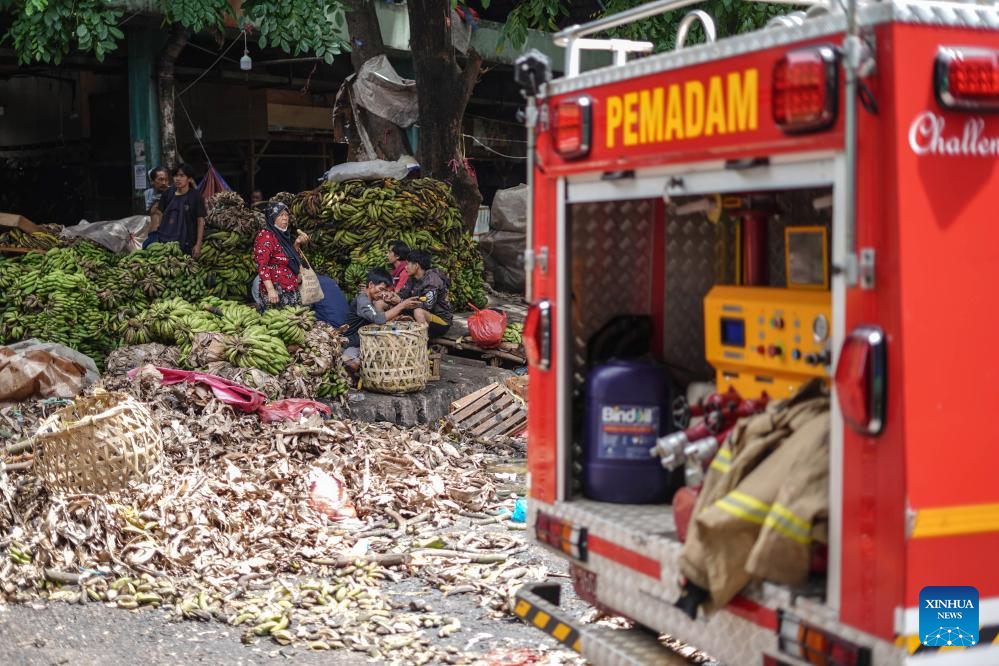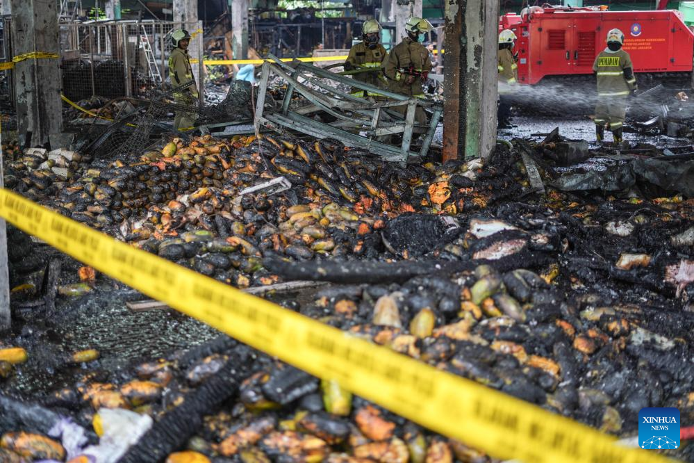 Firefighters work on site after a fire broke out at Pasar Induk Kramat Jati, a wholesale fruit and vegetable market in Jakarta, Indonesia, Dec. 15, 2025. (Photo by B. Nugraha/Xinhua)