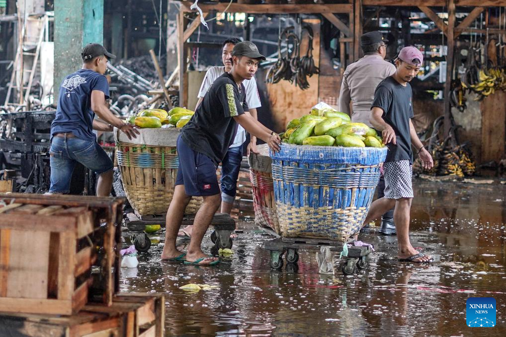 Workers relocate fruits to a secure zone after a fire broke out at Pasar Induk Kramat Jati, a wholesale fruit and vegetable market in Jakarta, Indonesia, Dec. 15, 2025. (Photo by B. Nugraha/Xinhua)