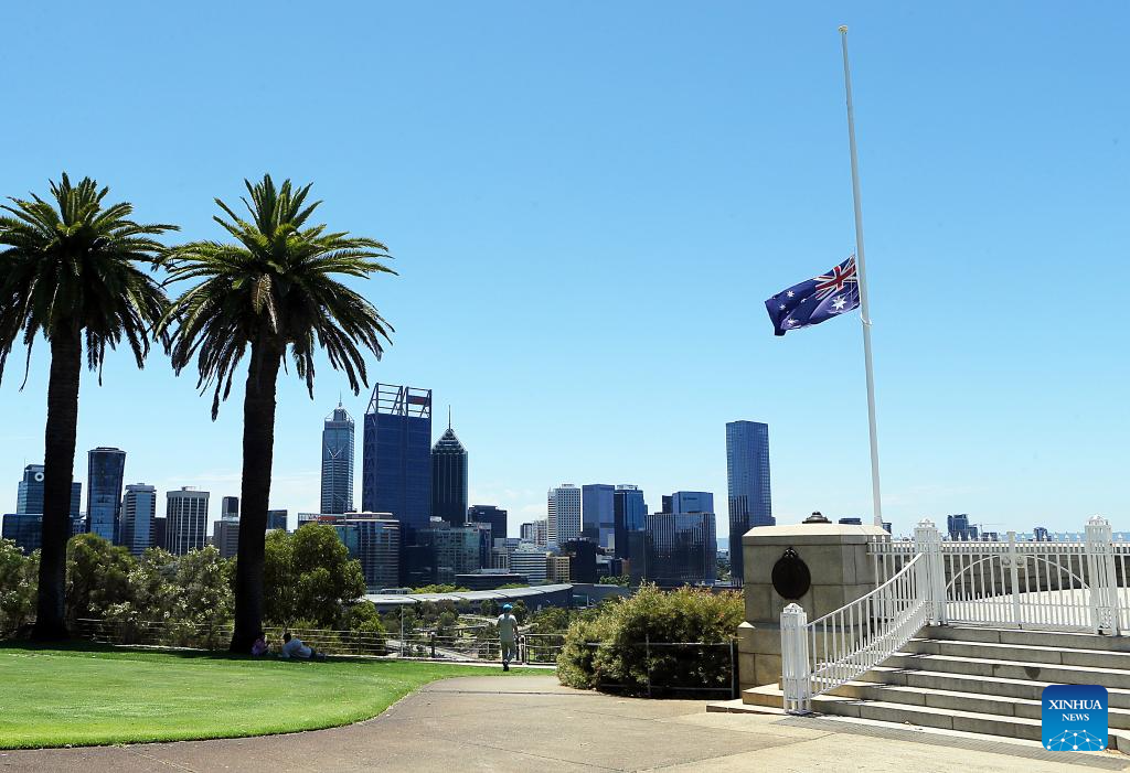 (251215) -- PERTH, Dec. 15, 2025 (Xinhua) -- Australian national flag flies at half-mast at Kings Park in Perth, Australia, Dec. 15, 2025.