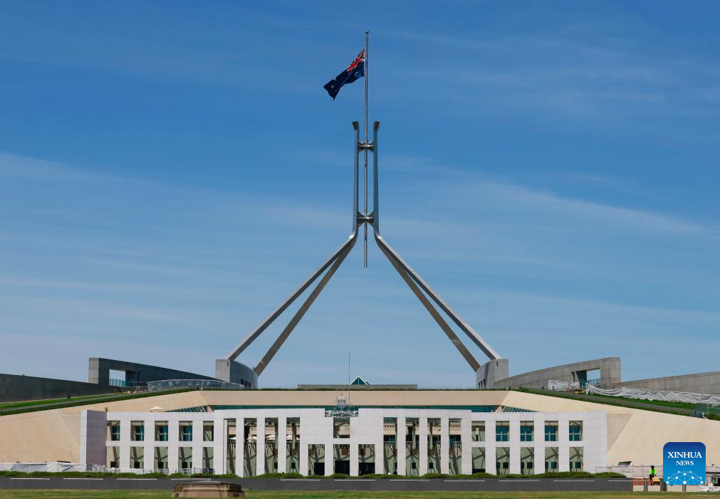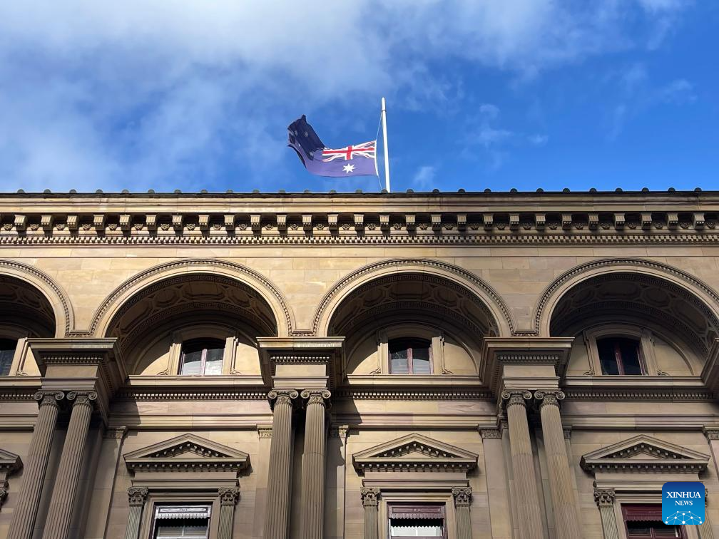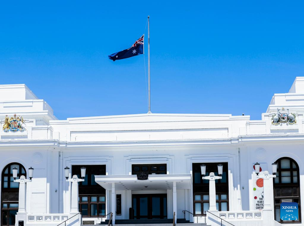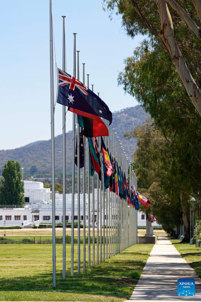 Flags fly at half-mast near Parliament House in Canberra, Australia, Dec. 15, 2025. The death toll from a shooting at Sydney's Bondi Beach on Sunday has risen to 16, with a father and son identified as the attackers, police said Monday. The deceased range in age from 10 to 87 years old and includes one of the attackers. Another 40 people were being treated in hospital for their injuries as of Monday morning, five of whom were in critical condition. (Photo by Chu Chen/Xinhua)