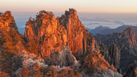Scenery of Huangshan Mountain scenic area at sunrise after snow in China's Anhui