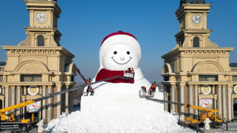 Workers build giant snowman in Harbin, China's Heilongjiang