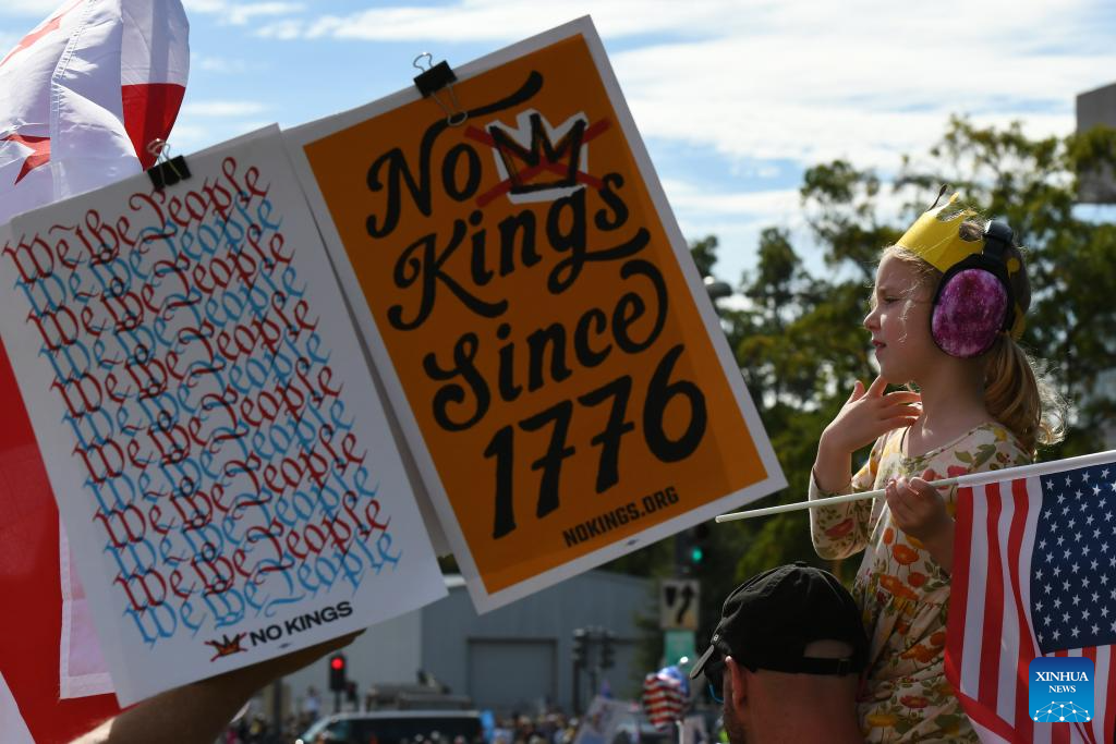 Following the first nationwide "No Kings" protest on June 14, this round of rallies, spanning all 50 states, came as the federal government shutdown entered its 18th day with no resolution in sight. (Xinhua/Li Rui)