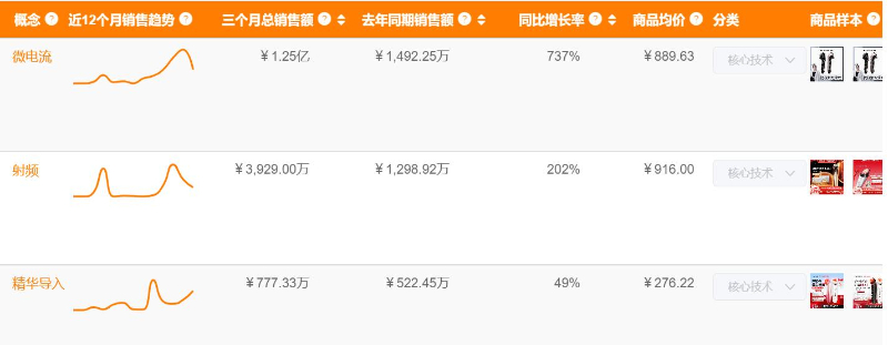在销售转化端,技术价值直接反映为消费买单意愿。射频、微电流相关产品销售额均突破千万元级,微电流类同比激增737%,射频类同比高增202%。体现出消费者对 “可感知功效” 产品的付费意愿提升,尤其是微电流类的高速增长,暗示 “即时轮廓紧致” 需求正在快速释放。