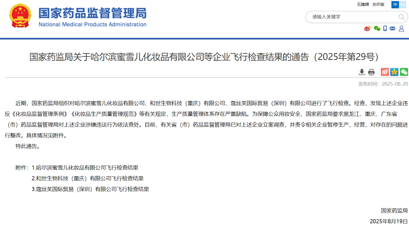 國(guó)家藥監(jiān)局關(guān)于哈爾濱蜜雪兒化妝品有限公司等企業(yè)飛行檢查結(jié)果的通告(2025年第29號(hào))