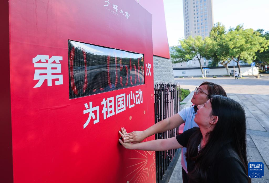 9月25日,在浙江省嘉兴市南湖区建设街道的子城城墙边,市民参加我为祖国心动打卡活动。