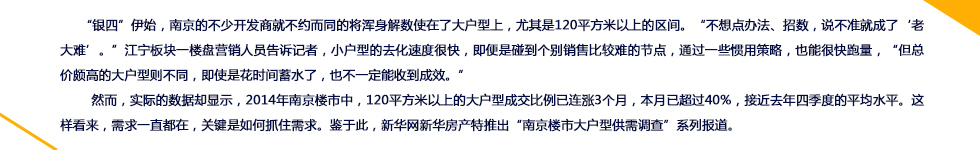 據(jù)黃媛分析,大戶型的熱銷主要原因有二。一是片區(qū)規(guī)劃的利好,周邊配套逐步成熟,吸引了主城區(qū)的客戶。而是其他片區(qū)單價(jià)昂貴,直接導(dǎo)致大戶型總價(jià)“離譜”,若想在南京改善居住品質(zhì),那么只有選擇還處于價(jià)格洼地的江北。黃媛認(rèn)為300萬(wàn)是個(gè)臨界點(diǎn),如果大戶型總價(jià)在300萬(wàn)以內(nèi),購(gòu)房者是可以接受的,但如果超過300萬(wàn),開發(fā)商就會(huì)比較頭疼房子怎樣才能賣出去。