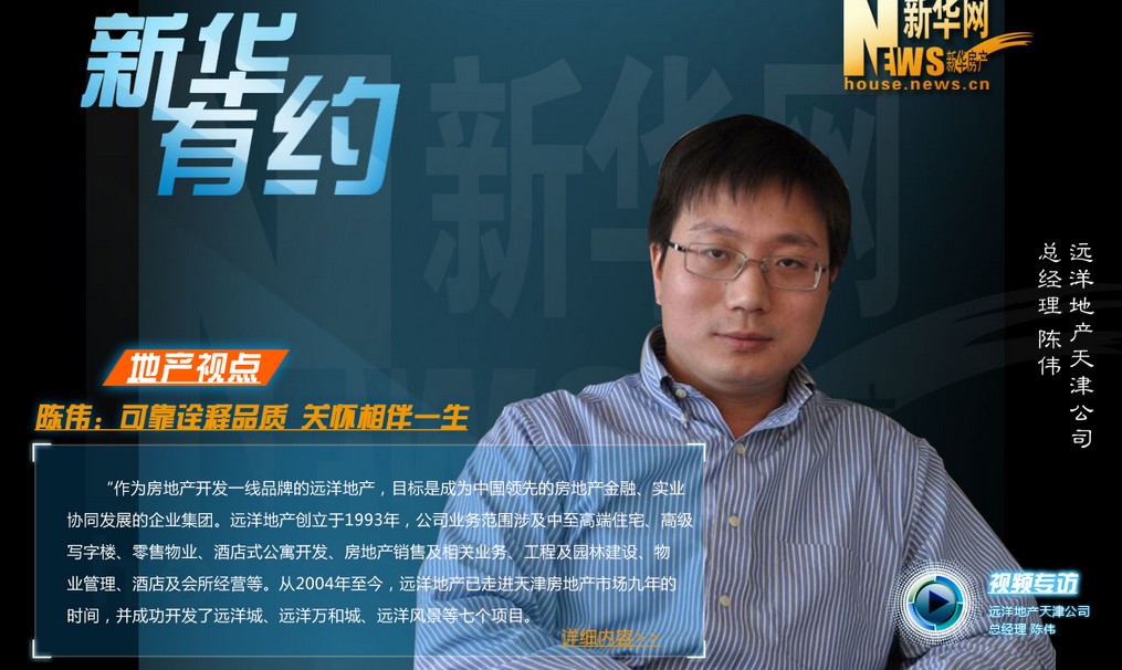 作為房地產(chǎn)開發(fā)一線品牌的遠(yuǎn)洋地產(chǎn),目標(biāo)是成為中國領(lǐng)先的房地產(chǎn)金融、實業(yè)協(xié)同發(fā)展的企業(yè)集團(tuán)。遠(yuǎn)2004年至今,遠(yuǎn)洋地產(chǎn)已走進(jìn)天津房地產(chǎn)市場九年的,并成功開發(fā)了遠(yuǎn)洋城、遠(yuǎn)洋萬和城、遠(yuǎn)洋風(fēng)景等七個項目。新華網(wǎng)新華房產(chǎn)榮幸的邀請到遠(yuǎn)洋地產(chǎn)天津公司總經(jīng)理陳偉,共同分享遠(yuǎn)洋地產(chǎn)在天津的成長之路。