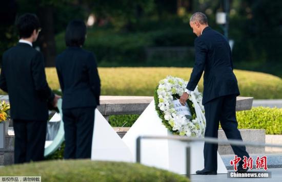 ????資料圖:2016年5月27日,美國(guó)總統(tǒng)奧巴馬乘直升機(jī)抵達(dá)日本廣島和平紀(jì)念公園附近,展開對(duì)和平紀(jì)念公園的訪問(wèn)并獻(xiàn)上花環(huán)。