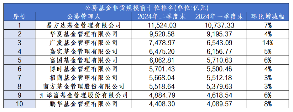 Wind数据显示,截至6月30日,公募机构非货基金规模排在行业前10的基金公司依次是:易方达基金、华夏基金、广发基金、嘉实基金、富国基金、博时基金、招商基金、南方基金、汇添富基金、鹏华基金。其中,广发基金的资产规模较一季度末增加了1086亿元,环比增幅为14%,规模增长较快;易方达基金、富国基金、鹏华基金分别增加了787亿元、714亿元、701亿元;华夏基金、南方基金、博时基金、汇添富基金的规模增长也超过500亿元。