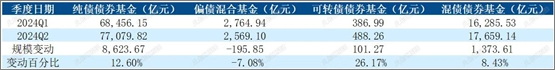 根据基金二级分类的分项来看,纯债债券基金、混债债券基金和可转债债券基金管理规模均有所上升,偏债混合基金管理规模有所下降。纯债债券基金资产净值2024年二季度相比上一季度合计上升8623.67亿元,升幅约12.60%。可转债债券基金规模上升相对幅度较大,升幅约为26.17%。偏债混合基金2024年二季度基金资产净值相比上一季度合计下降195.84亿元,降幅约为7.08%。