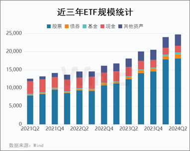 交易型开放式指数基金方面,据Wind数据显示,2024年二季度,ETF规模再创新高,达2.47万亿元,其中股票型ETF规模为1.81万亿元,占整体ETF规模比例73.31%。2024年二季度整体ETF规模较三年前增长96.98%,季度平均增长率为13.75%。宽基ETF环比增长45.11%,规模突破1万亿元。