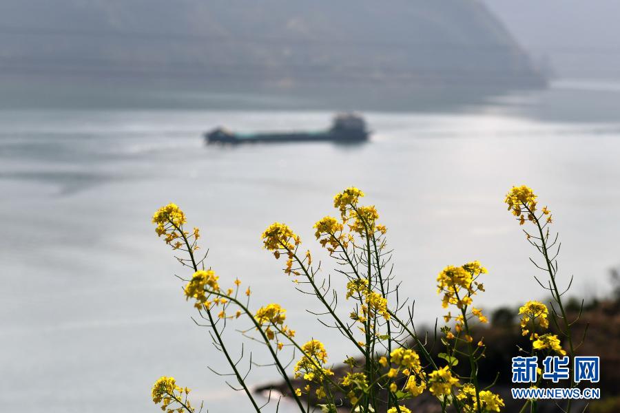 2月14日,貨輪行駛在長(zhǎng)江湖北省秭歸縣江段,岸邊的油菜花吐露芬芳。新華社發(fā)(王輝富 攝)