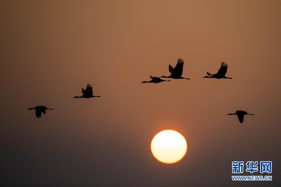 日出時(shí)分,黑頸鶴在大山包黑頸鶴國家級(jí)自然保護(hù)區(qū)飛翔(2月27日攝)。新華社記者 胡超 攝