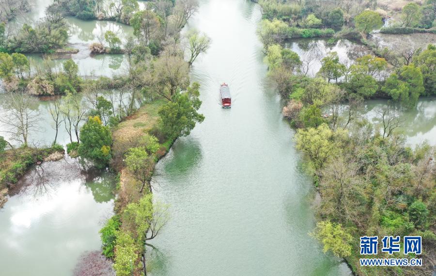 3月2日,游船行駛在西溪濕地水道上(無人機(jī)照片)。