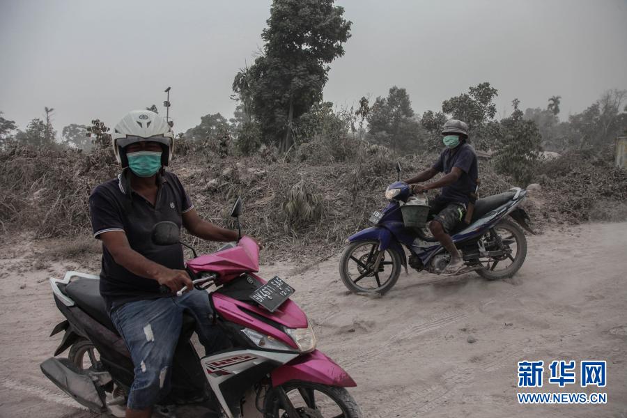 3月2日,印度尼西亞北蘇門答臘省卡羅的居民行駛在火山灰覆蓋的道路上。印度尼西亞國(guó)家抗災(zāi)署2日說(shuō),北蘇門答臘省錫納朋火山當(dāng)天上午劇烈噴發(fā),噴出的火山灰高達(dá)5000米。目前尚無(wú)人員傷亡和財(cái)產(chǎn)損失報(bào)告。