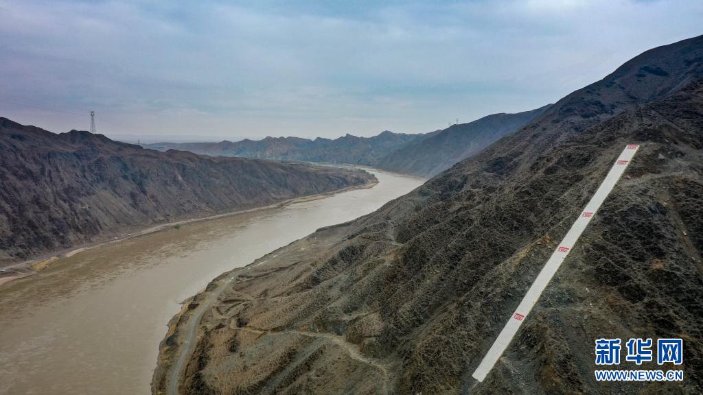 這是位于寧夏中衛(wèi)市黃河黑山峽河段的水位標(biāo)記(4月3日攝,無人機(jī)照片)。