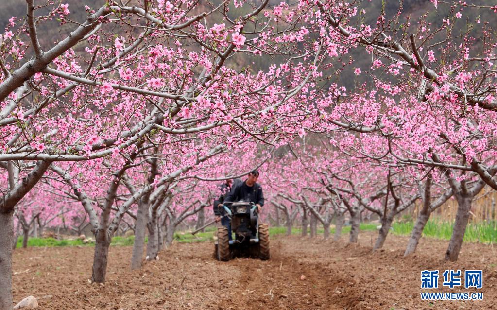 4月5日,河北省石家莊市井陘縣測(cè)魚鎮(zhèn)楊莊村村民駕駛農(nóng)機(jī)在桃園里作業(yè)。