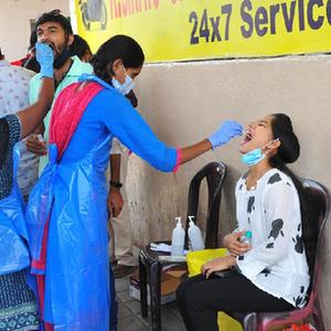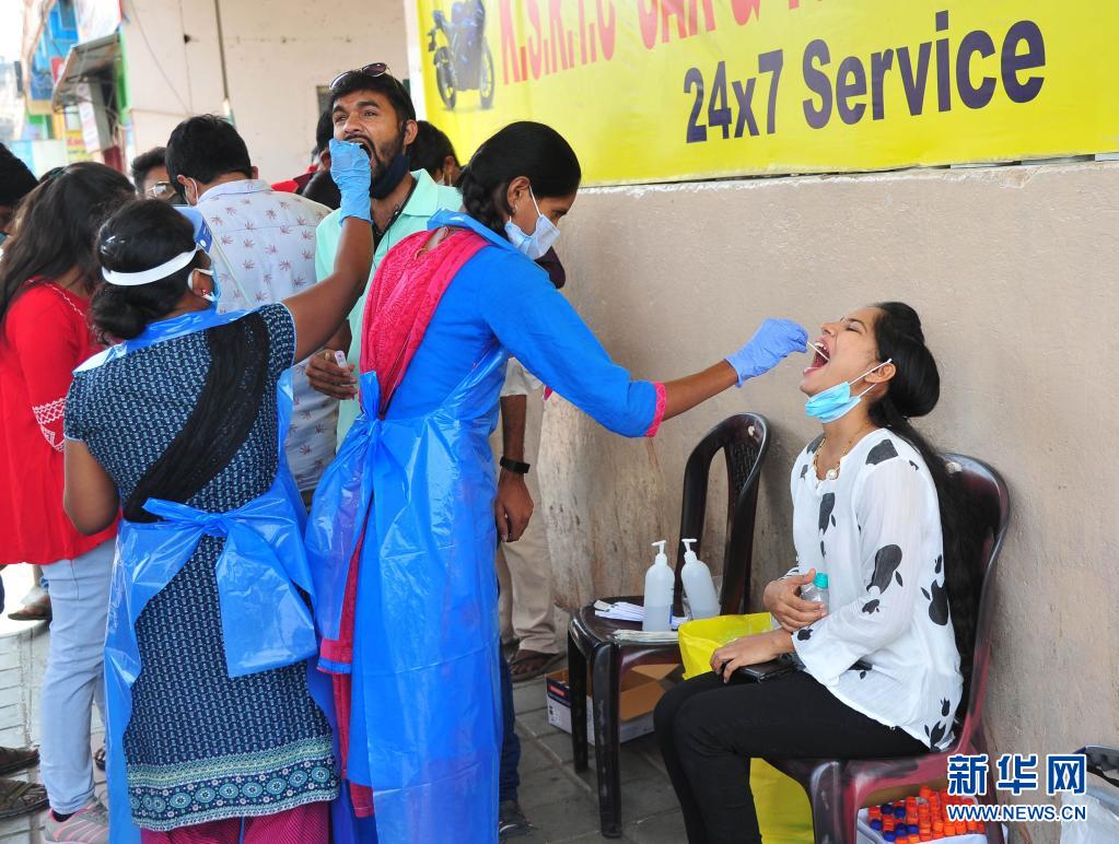 4月11日,人們在印度班加羅爾的一個公交站接受新冠病毒檢測取樣。