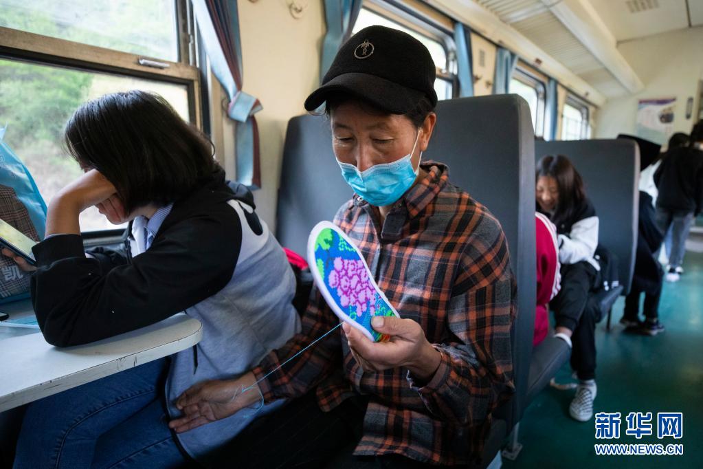 在5633次列車上,一名彝族乘客在制作彝繡鞋墊(4月11日攝)。新華社記者 沈伯韓 攝