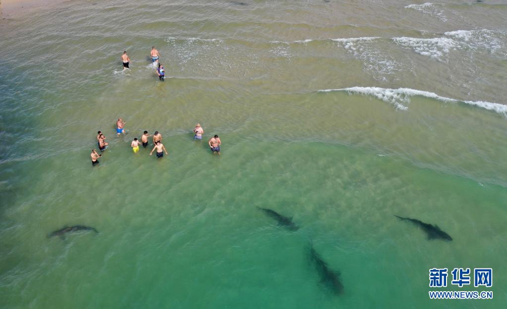 4月20日,在以色列北部城市哈代拉的海邊,鯊魚從人們身邊游過(guò)(無(wú)人機(jī)照片)。