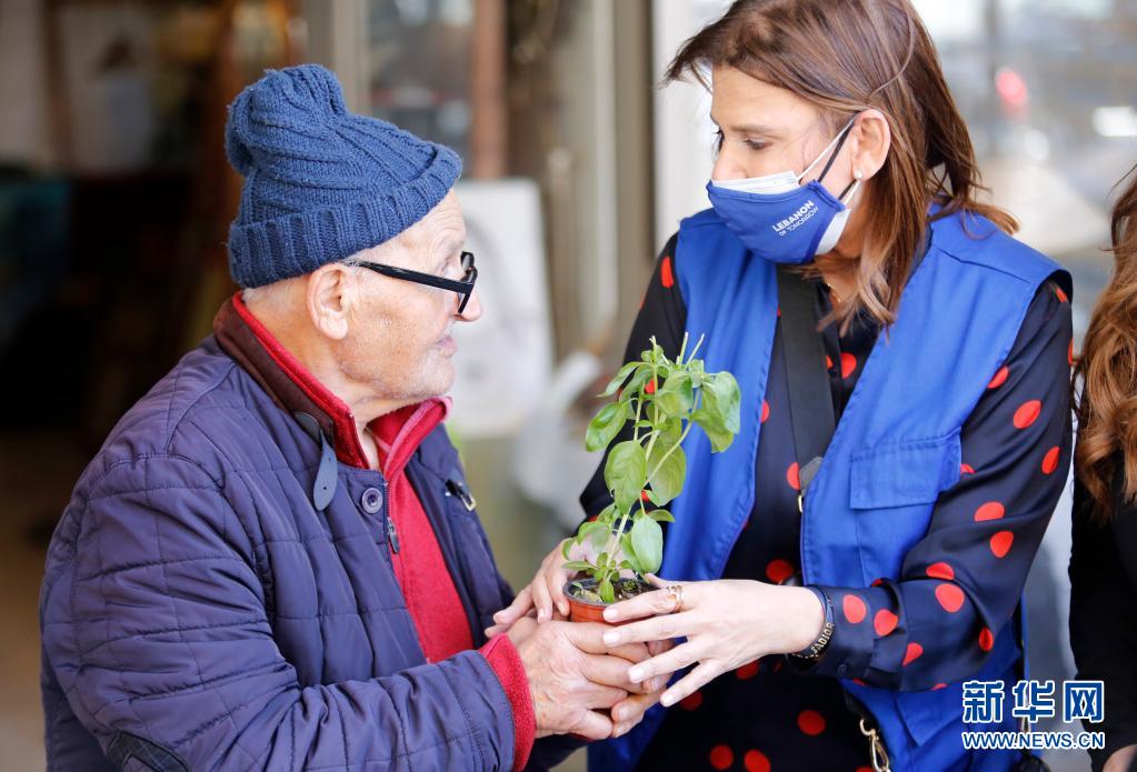 4月22日,“世界地球日”活動(dòng)參與者在黎巴嫩首都貝魯特向一名男子派發(fā)秧苗。