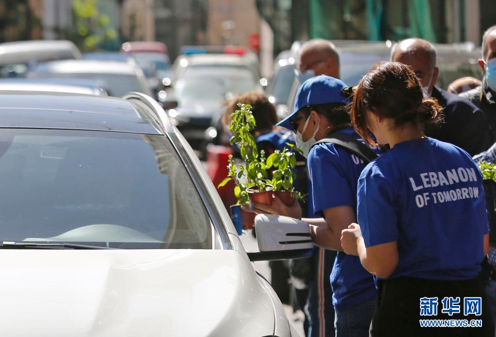 4月22日,“世界地球日”活動(dòng)參與者在黎巴嫩首都貝魯特向一名司機(jī)派發(fā)秧苗。
