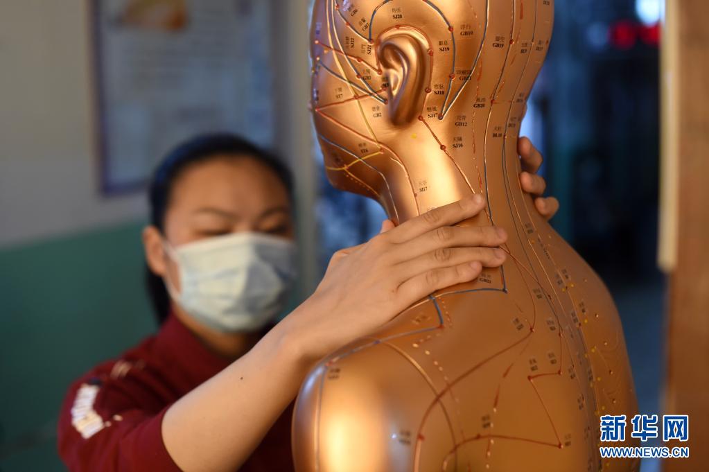4月28日,葉景芬在自己實習(xí)的龍泉市中醫(yī)院內(nèi)感受中醫(yī)針灸穴位。新華社記者 韓傳號 攝